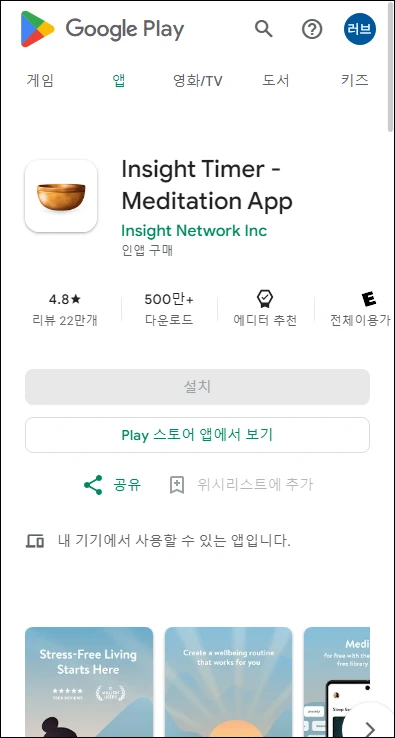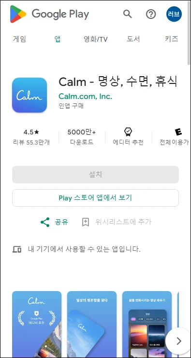 이번엔 명상음악 감상이 가능한 앱들입니다. Calm, Insight Timer, 수면과 고요함을 위한 명상 등 대표적인 몇 가지만 소개할게요.