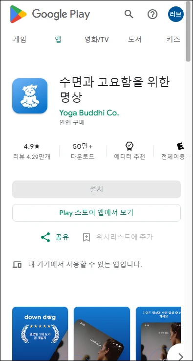 수면과 명상 부문 1위 앱입니다. 가이드와 함께 하는 명상 프로그램이 3~25분 길이로 다양하게 준비되어 있어요.