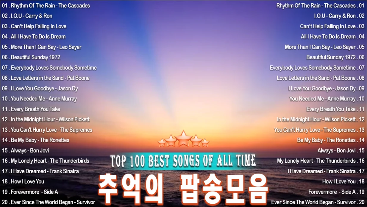 감미로운 추억의 팝송 22개 리스트를 모아 놓은 채널입니다. 한국인이 좋아하는 비교적 최신 팝송도 조금씩 섞여 있는 것 같네요.